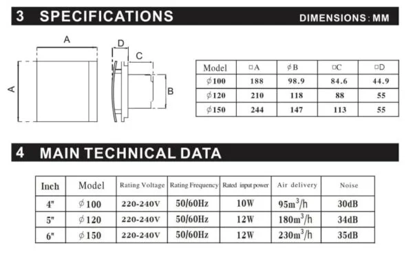 | 6″ | Ø150 | 220–240 V | 50/60 Hz | 12 W | 230 m³/h | 35 dB |